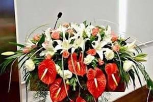 商务庆典:讲台花、桌花、手捧花、胸花、庆典花篮、鲜花拱门、现场花艺等